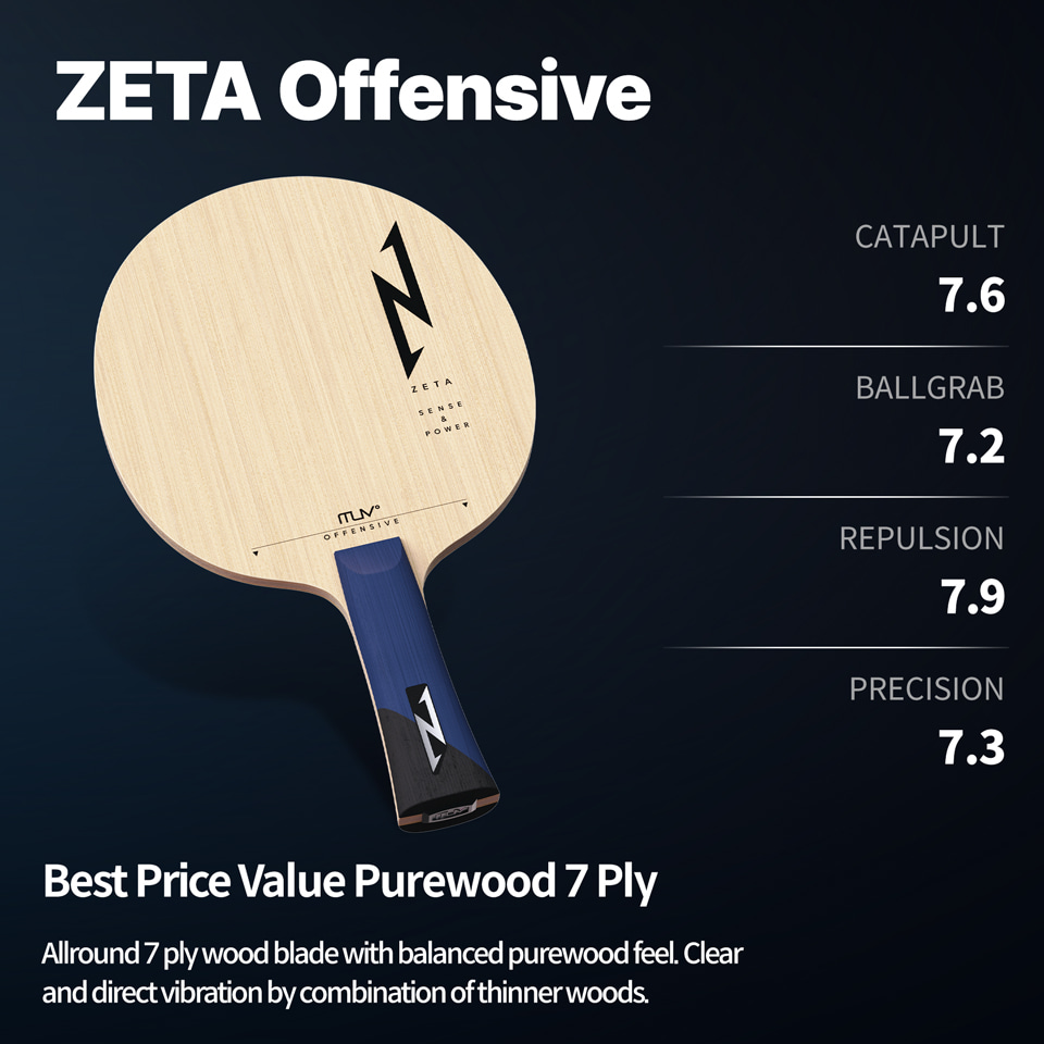 Allround 7 ply wood blade with balanced purewood feel. Clear and direct vibration by combination of thinner woods.